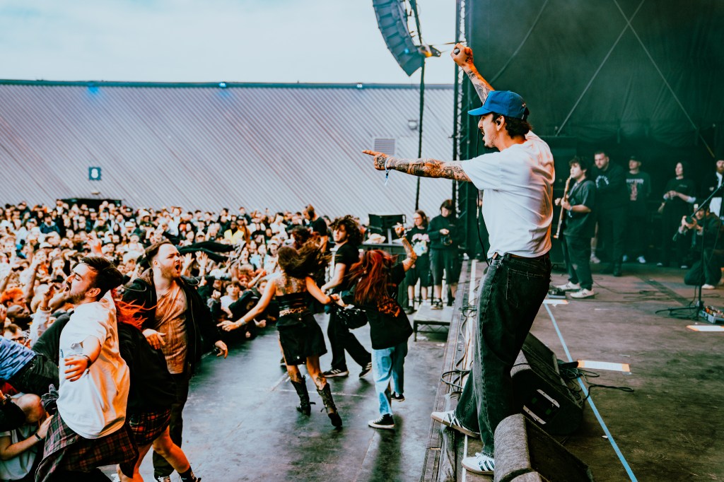 2022 headliners TOUCHÉ AMORE were on next on the outdoor stage, which saw them put on a whirlwind of a performance. ‘Flowers and You‘ opened the act, and the crowd wasted no time in utilising the stage as a sea of people began to pile upon one another. With a full repertoire to their name, the band announced that a new record is on the way, to a resounding reaction from the Outbreak audience. Jeremy Bolm’s scratchy vocals complement the band’s more ambient sound nicely. Soon after, TA launched into their brand-new song, ‘Nobody’s’ and then everything went back to normal with a tonne of hits and fan favourites to keep the party going.