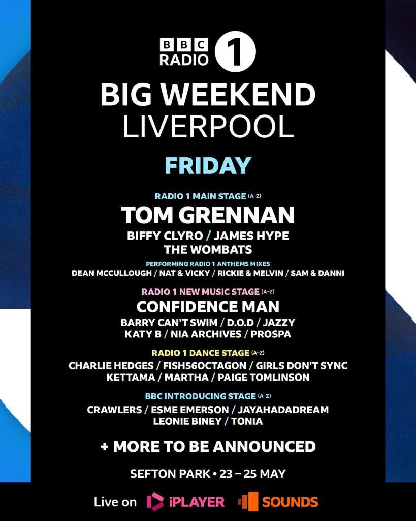 Saturday includes BLOSSOMS, WOLF ALICE, TOM ODELL and MYLES SMITH on the main stage, as well as AITCH B2B AJ TRACEY topping the Radio 1 New Music Stage.