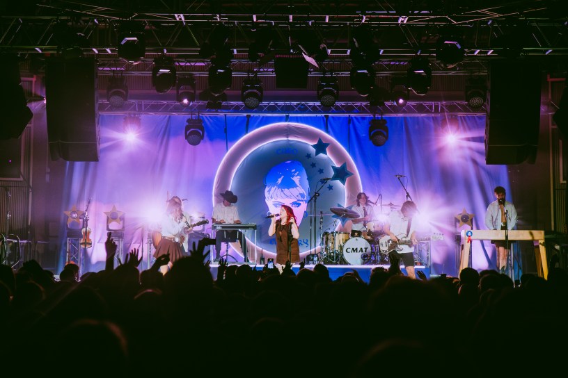 As the eight sided building’s lights began to dim, an ear piercing scream from the 1800 in attendance welcomed a surprise appearance from CMAT, which saw the Irish superstar emerge at the opposite side of the room before making her way through the crowd during the opening song ‘Janis Joplining‘. Once she joined “The very sexy CMAT band” on stage, the audience erupted in cheers again, as the very amusing and candid ‘The Jamie Oliver Petrol Station‘ soon followed to further enhance the usual not-so-serious performance that CMAT delivers every time.