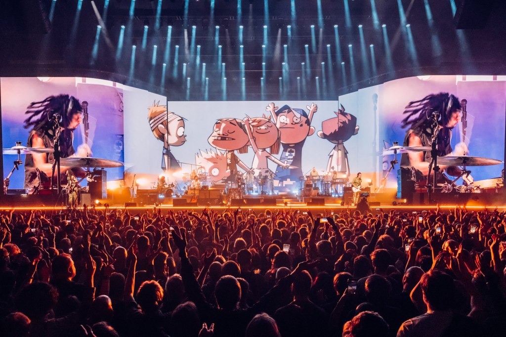 One by one, each member stepped on to the stage as the animation for ‘The Mountain‘ played on the screens. The crowd roared as Albarn made his way from the curtain, up the steps and strolled across the stage to the centre. Grinning from ear to ear, his appreciation for the positive reception couldn’t be hidden. Continuing with the new material, ‘The Happy Dictator’ followed alongside ‘Tranz‘ before stepping back in time for fan favourites ‘Tomorrow Comes Today‘ and ‘19-2000‘. Both tracks from their self-titled debut were met with huge cheers from the capacity arena crowd. This was exceeded though by Joe Talbot from IDLES‘ appearance during ‘The God of Lying‘. Talbot and Albarn starred each other down as they exchanged lyrics, showcasing not only artist chemistry but their experience on the big stages to deliver it with sheer power.